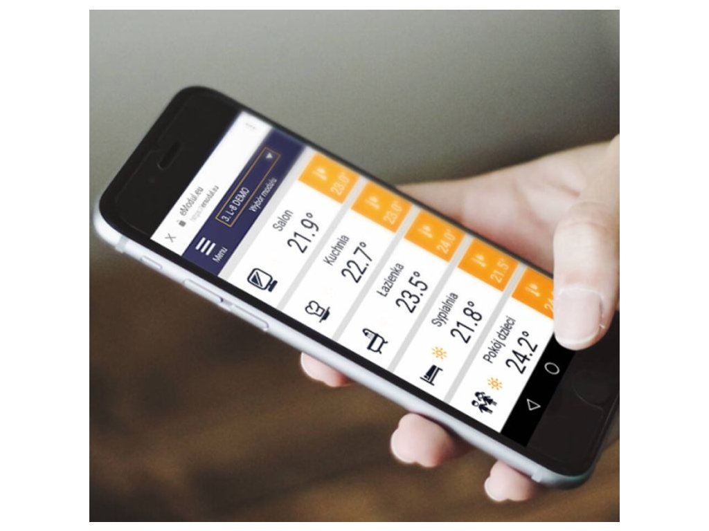 Když jsme mimo domov, můžeme systém vytápění spravovat pomocí aplikace nainstalované ve vašem chytrém telefonu nebo tabletu. Díky němu je možné odkudkoli na světě kdykoli během dne kontrolovat, co se děje doma. Po instalaci aplikace eModul můžete své mobilní zařízení plně integrovat se systémem chytré domácnosti. To dává uživateli plnou kontrolu nad všemi zařízeními připojenými k systému. Jedná se o velmi pohodlné řešení, zvláště vezmeme-li v úvahu, že svůj telefon nosí téměř každý neustále u sebe. Díky připojení k internetu můžete ovládat vytápění odkudkoli na světě, bez ohledu na to, zda jsme stovky kilometrů od domova na dovolené nebo odpočíváme na zahradě na pozemku.